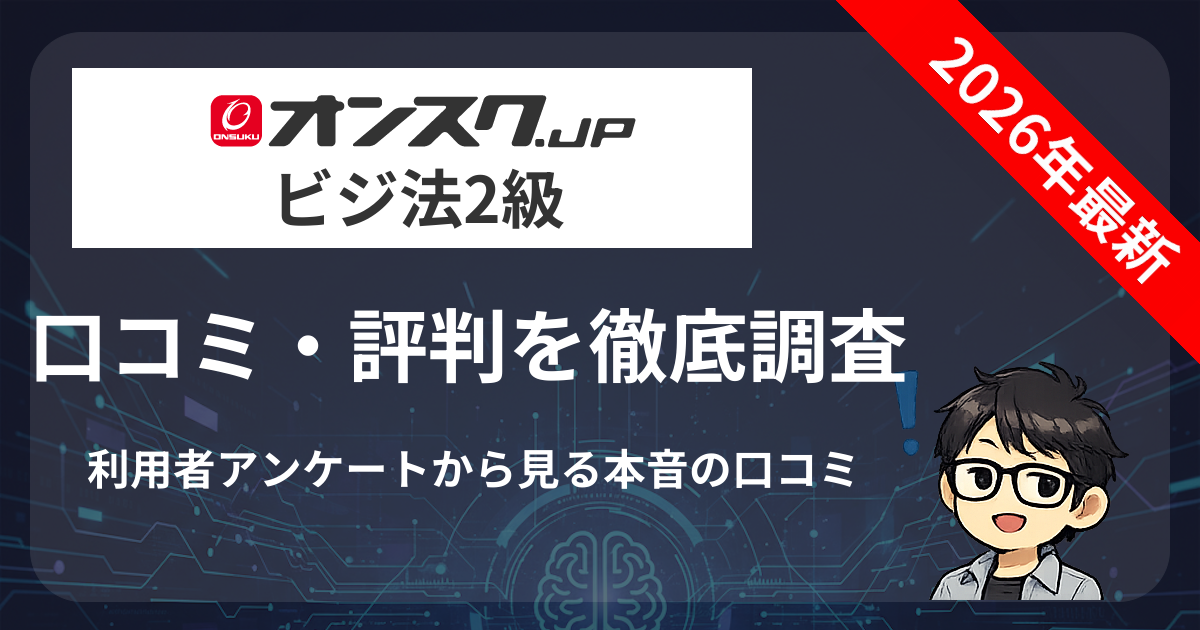 この記事では、X(旧Twitter)の投稿、レビューサイト、口コミ掲示板を徹底調査。オンスクのビジ法2級講座の良い評判・悪い評判の両方を正直にお伝えします。
