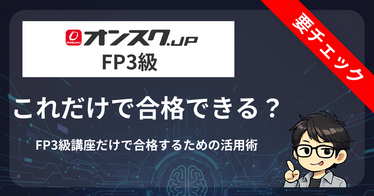 FP3級は合格率70-80%の試験です。オンスクの講義約12時間+問題演習約400問を繰り返せば、十分合格できます。多くの合格者がオンスクだけで合格しています。