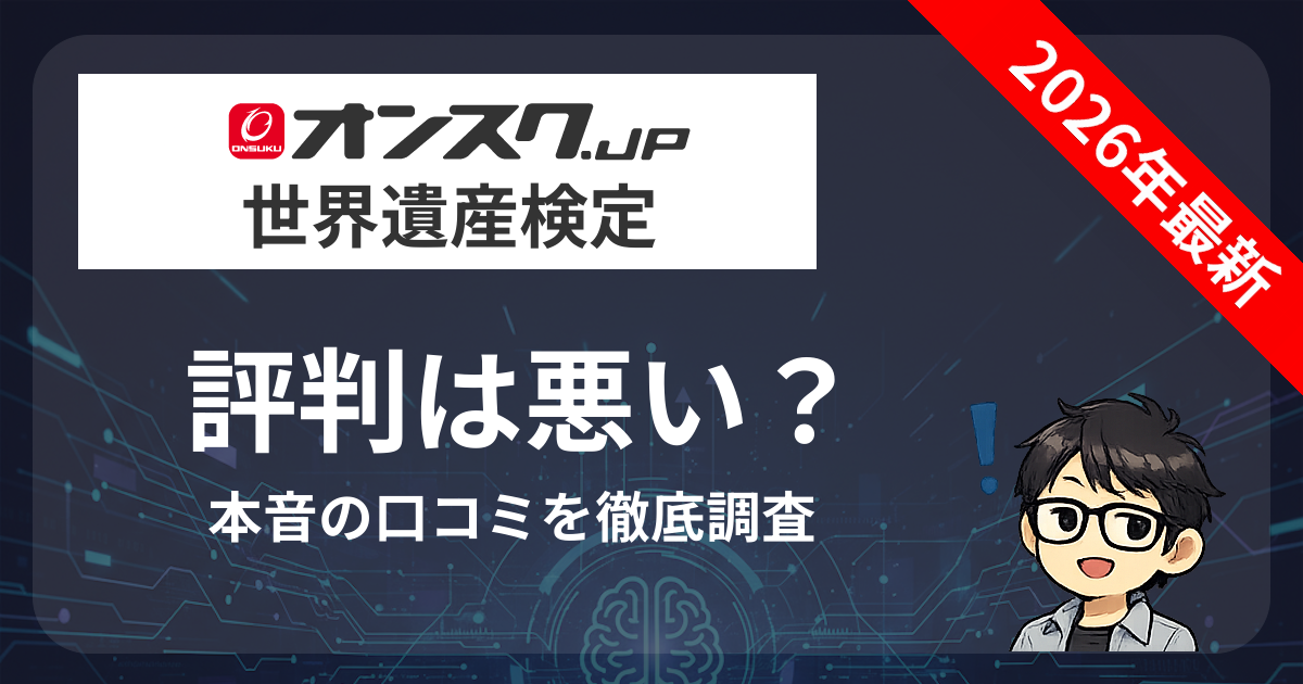 この記事では、X(旧Twitter)の投稿100件以上、レビューサイト、口コミ掲示板を徹底調査し、オンスク.JPの世界遺産検定講座の悪い評判・デメリットを正直にお伝えします。対処法も紹介するので、納得した上で申し込めます。