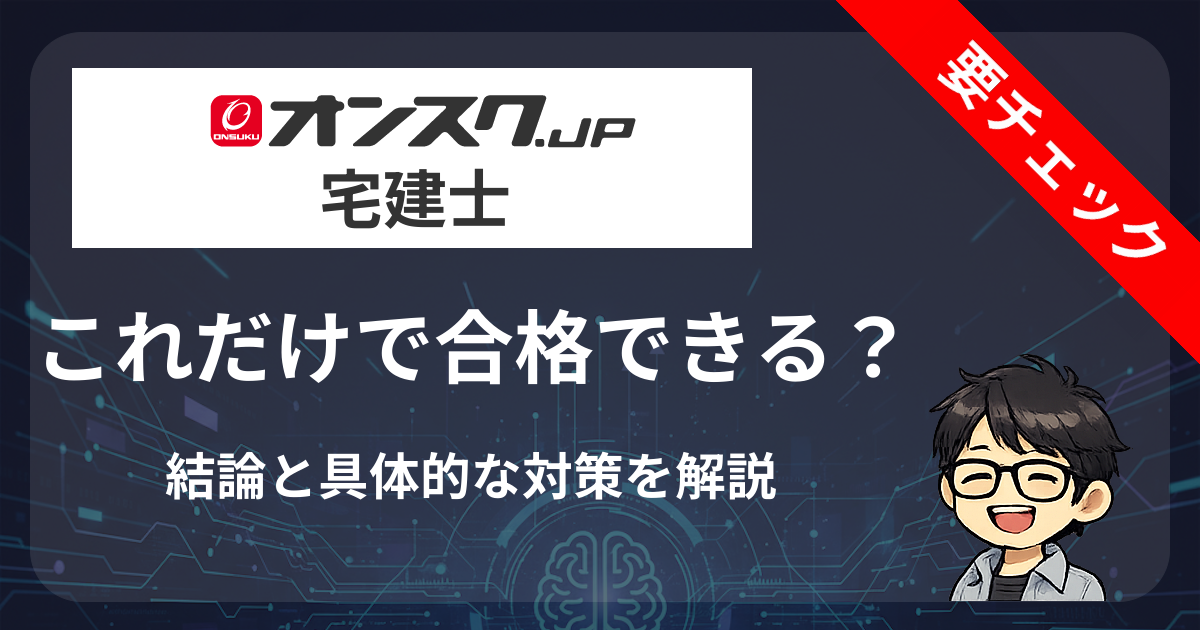 オンスクの宅建講座は「基礎固めには最適」ですが、「過去問演習は別途必要」です。オンスク + 過去問集で、トータル約1万円でも合格は十分可能です。