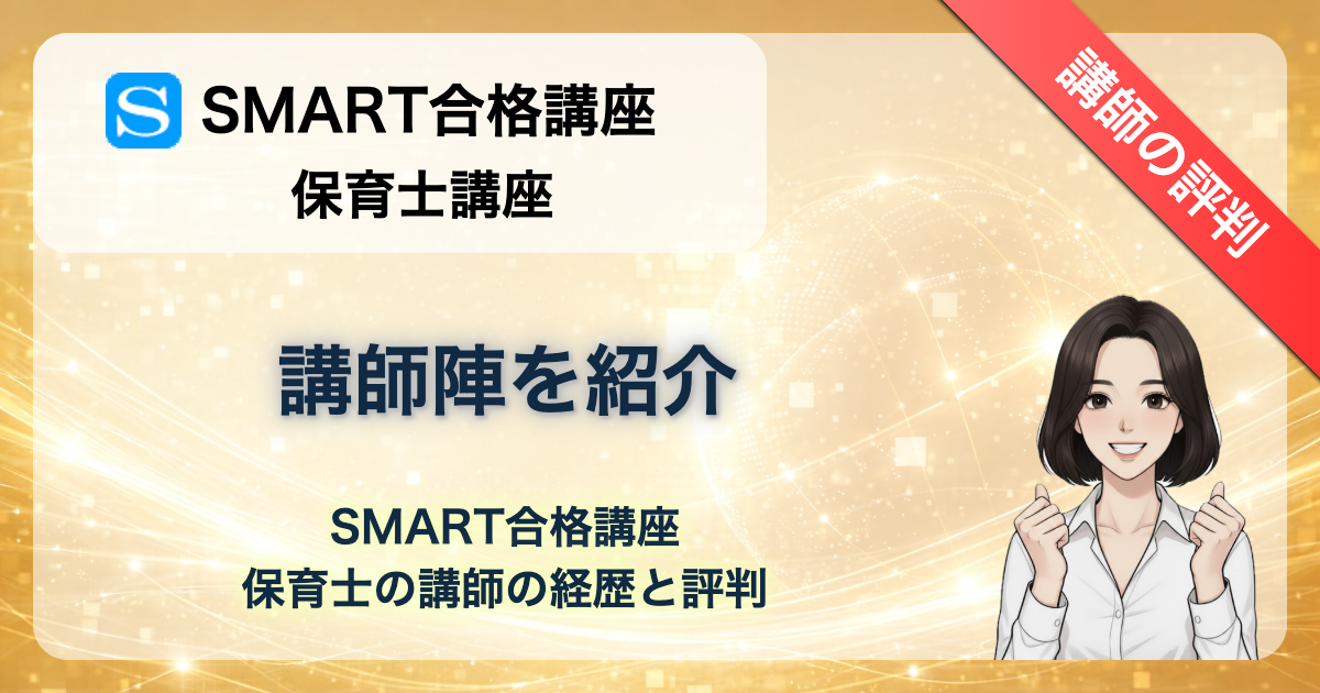 「SMART合格講座の保育士講座、講師はどんな人?」「保育の現場を知っている先生?」「試験に出るポイントを教えてくれる?」