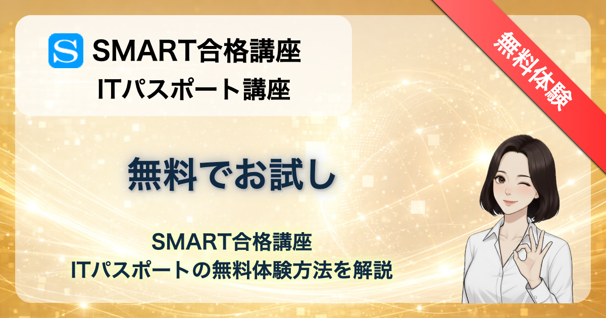 SMART合格講座のITパスポート講座は、 登録不要・完全無料 でサンプル講義を体験できます。IT知識ゼロの方でも、まずはサンプル講義を視聴して講師との相性や講座の雰囲気を確認してみてください。